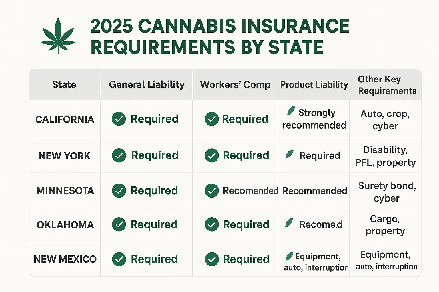 Let’s break down the key cannabis insurance requirements for 2025 in California, New York, Minnesota, Oklahoma, and New Mexico.