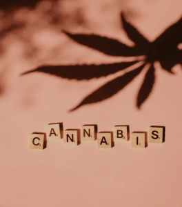 Cannabis spelled out with letter blocks, accompanied by a shadow of a cannabis leaf, emphasizing the cannabis industry context relevant to OG Cannabis Insurance.